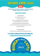 Mikä: SAK Nuorten risteily – Ikuinen vappu 2023 Milloin: 23.-24.9.2023 Missä: Viking Line XPRS Kenelle: SAK:laisten ammattiliittojen yli 18-vuotiaille jäsenille ja myös muille kiinnostuneille nuorille Lisätietoja ja lipunmyynti: https://matkapojat.fi/ikuinenvappu2023 Lippujen hinnat alkaen 25 euroa. Hinta sisältää eestaas-matkat, hyttipaikan, lauantain monipuolisen brunssin ja buffetillallisen sekä sunnuntain maittavan meriaamiaisen.
